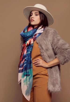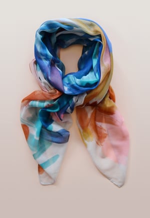 Un pañuelo que es como un cuadro, con una mezcla de pinceladas en bonitos colores que representa un paisaje abstracto.