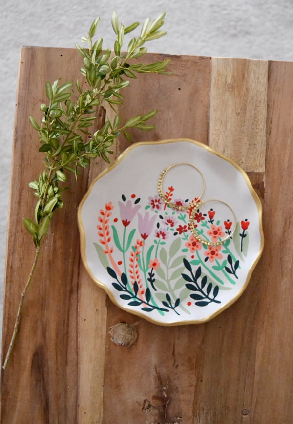 Plato de cerámica decorativa hecha y pintada a mano con el canto dorado.