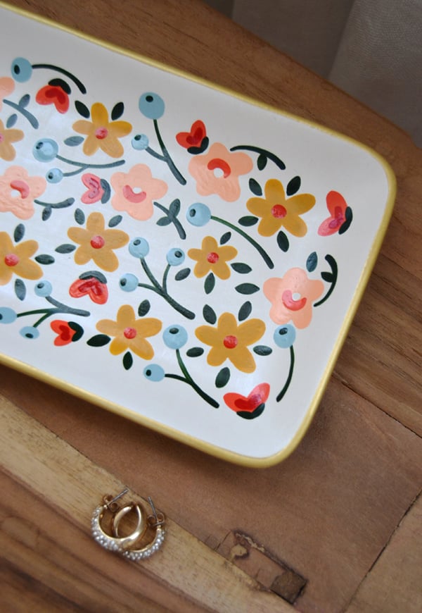 Bandeja de cerámica pintado a mano con el canto dorado.