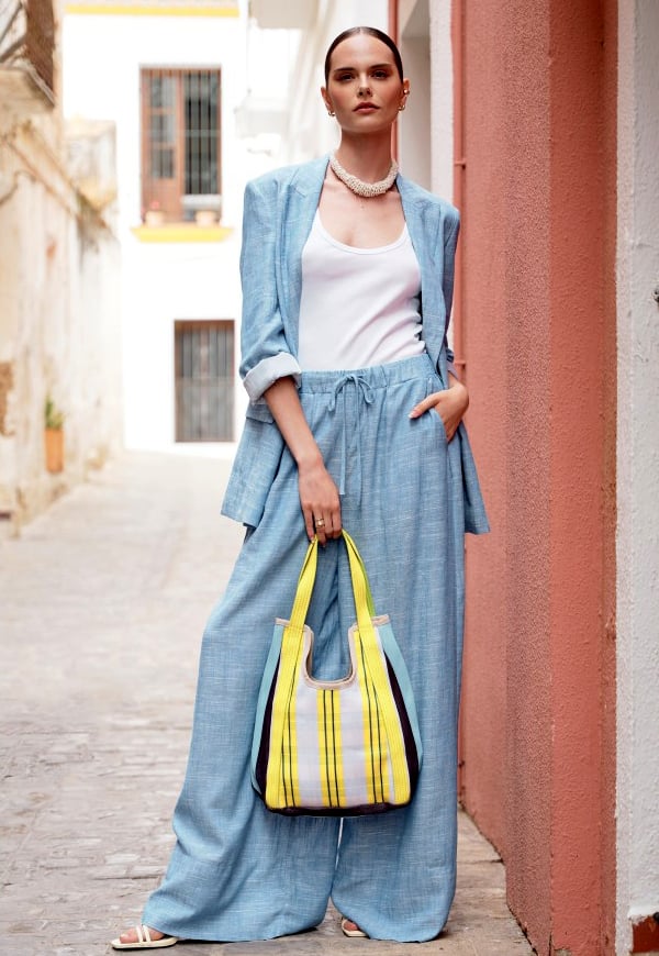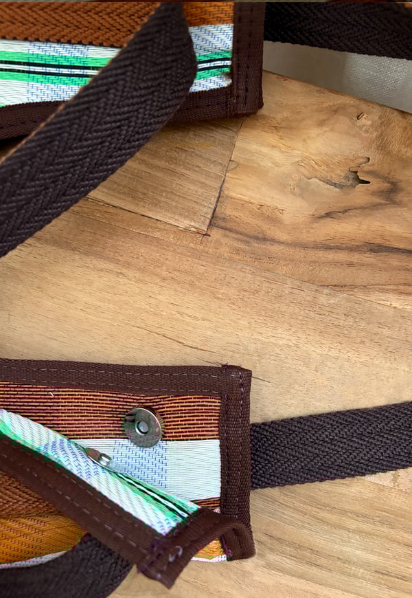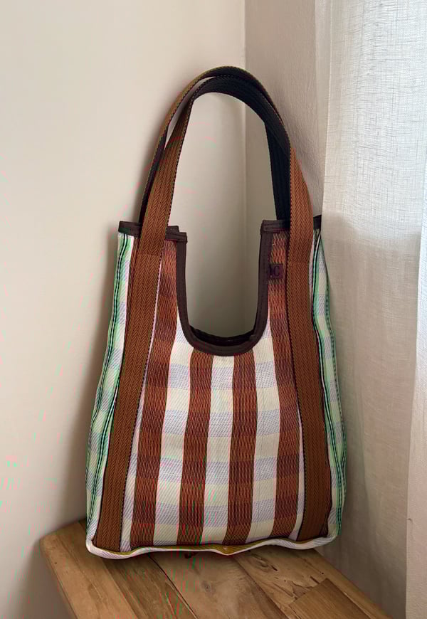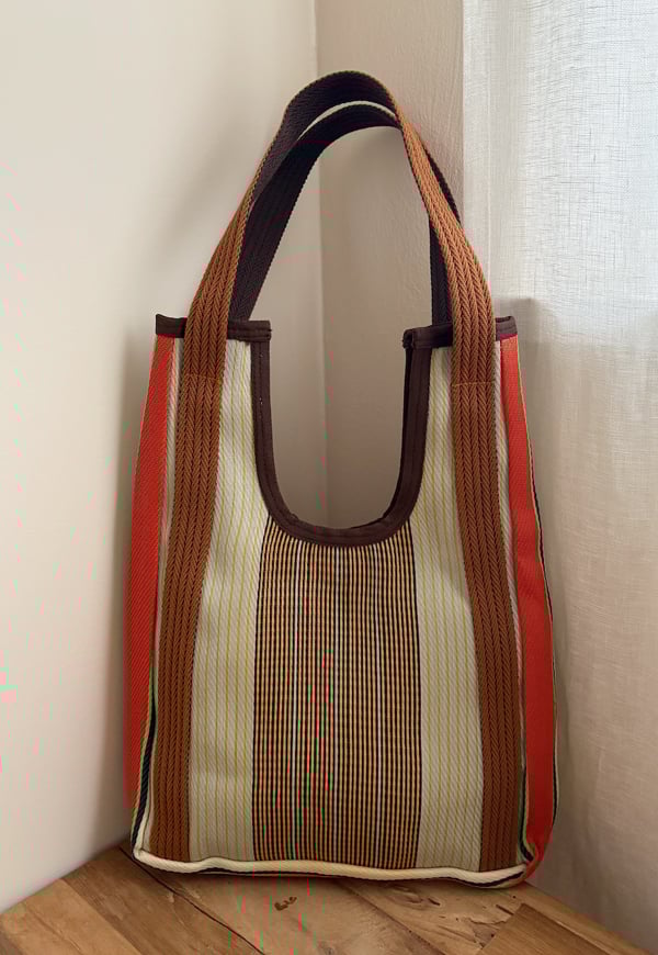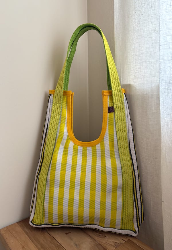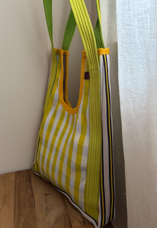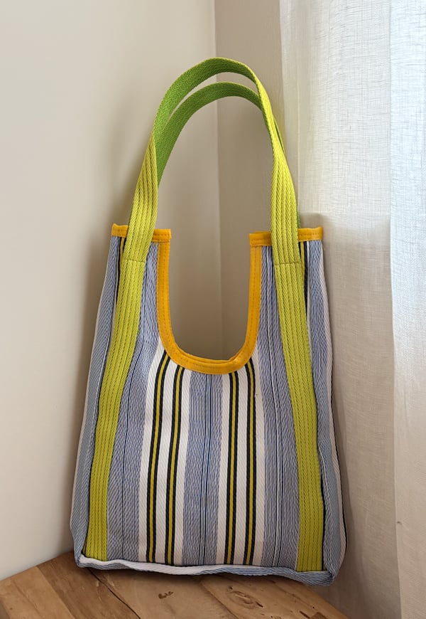 Bolsos ligeros con diseño de rayas hechos de material reciclado y cintas de algodón.