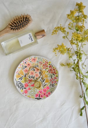 Plato de cerámica decorativa hecha y pintada a mano con el canto dorado.